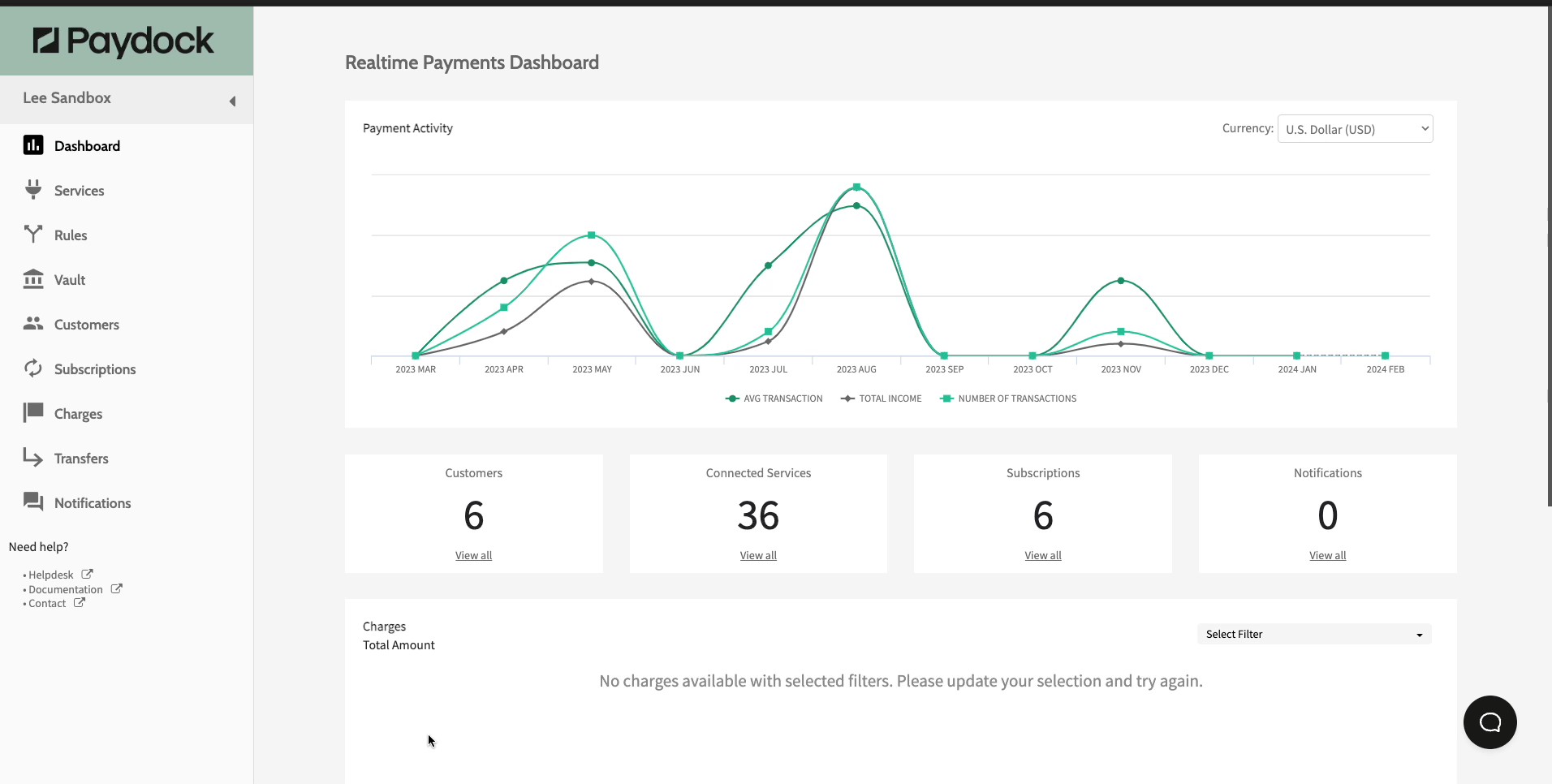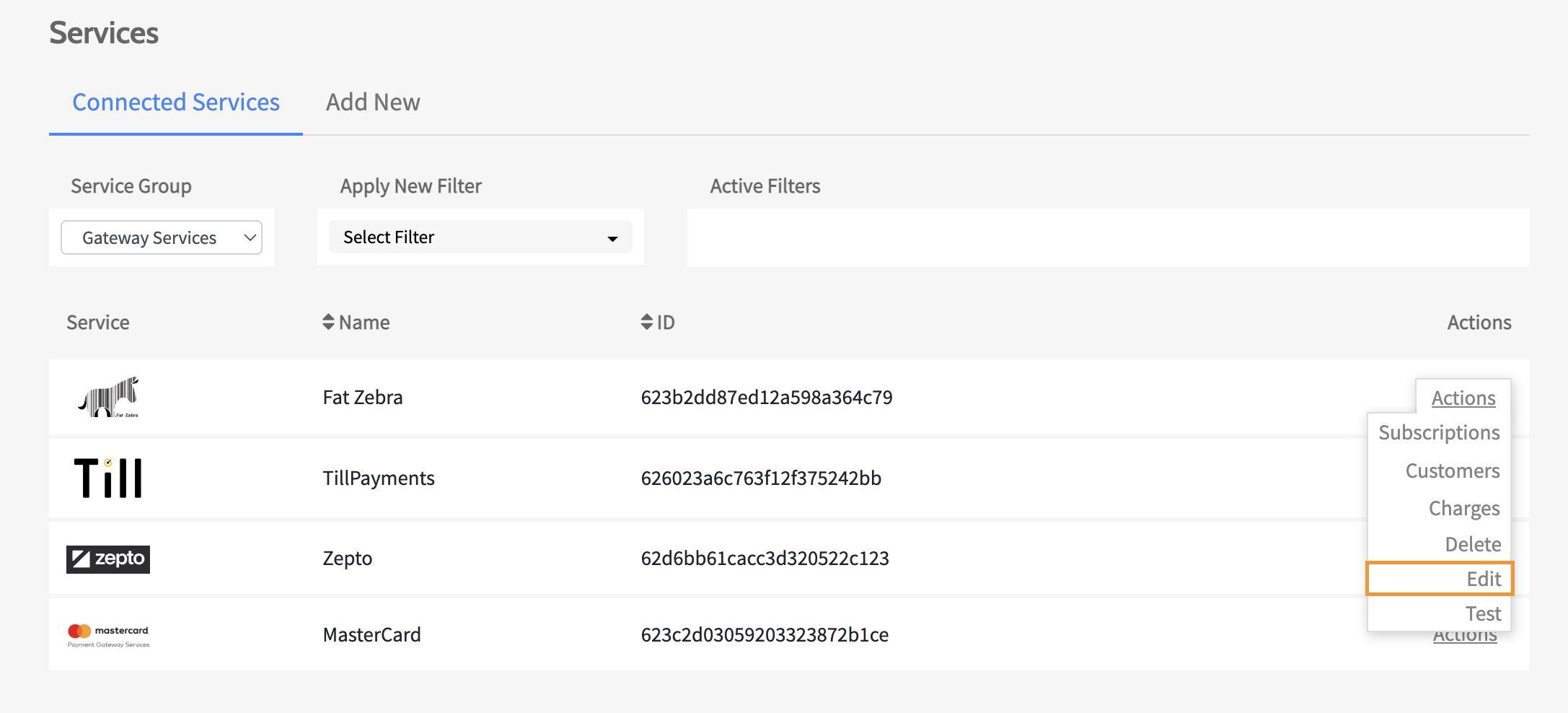 - Go to Services > Actions > Subscriptions, Customers or Charges for the preferred Service. You can filter by Service Group or search by name.