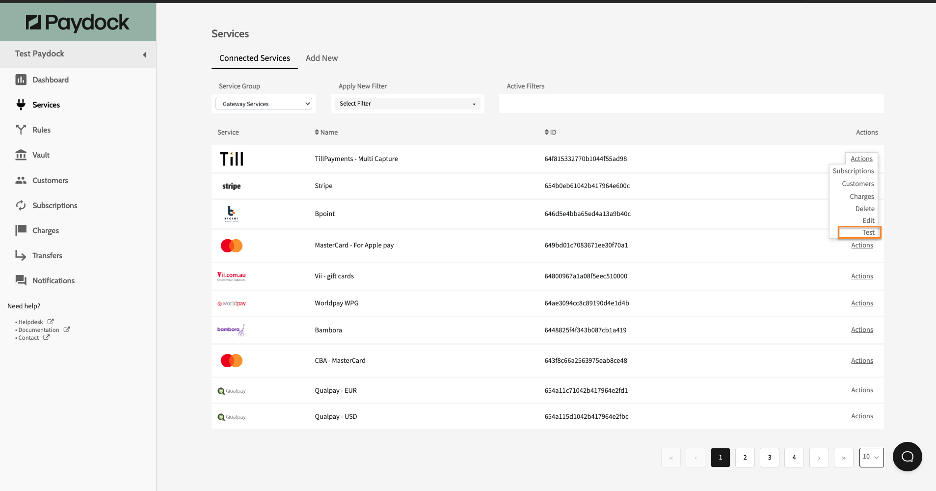 - Go to Services > Actions > Test for the preferred Service. You can filter by Service Group or search by name.