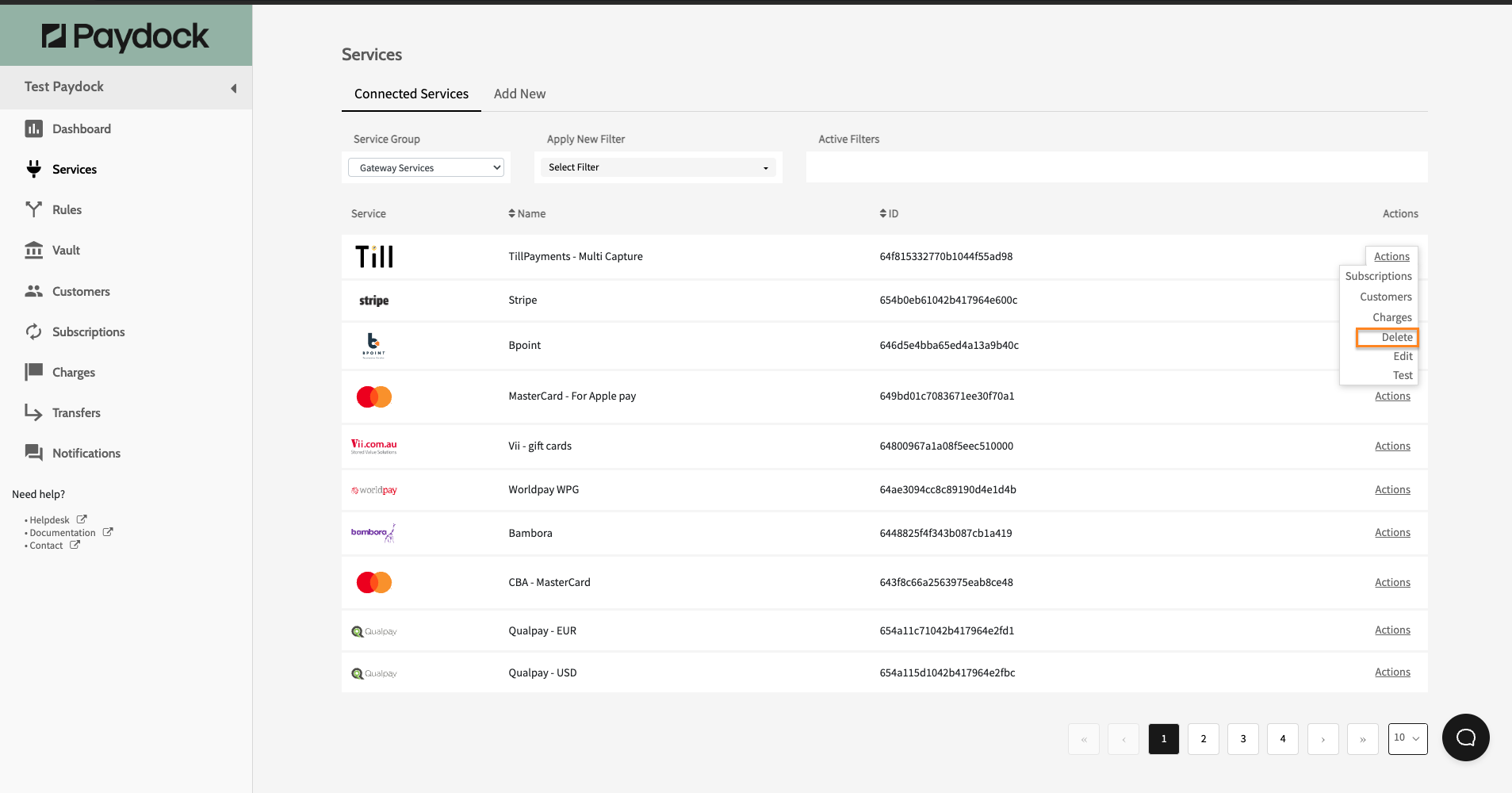 - Go to Services > Actions > Delete for the preferred Service. You can filter by Service Group or search by name.