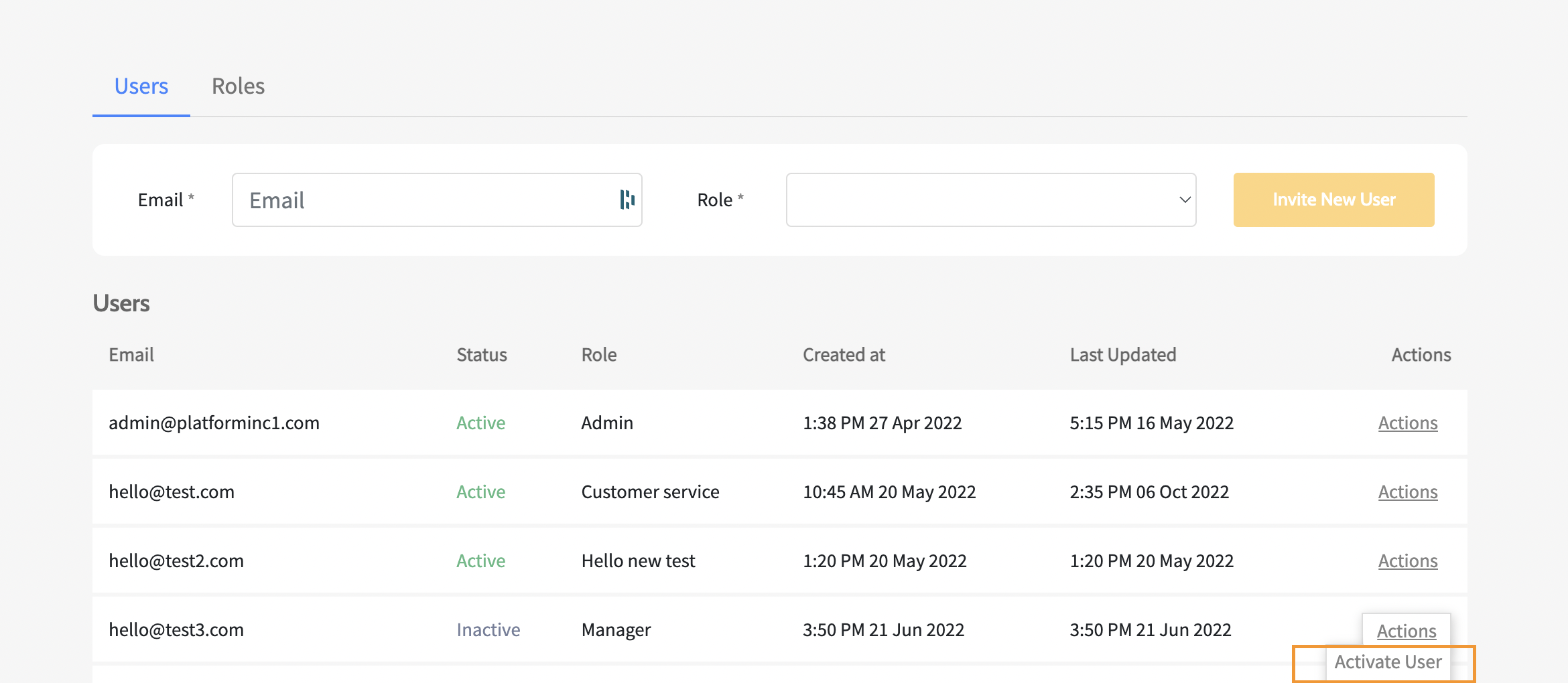 - Go to Profile menu > Brand Users > Users > Actions > Activate User for the specified User.