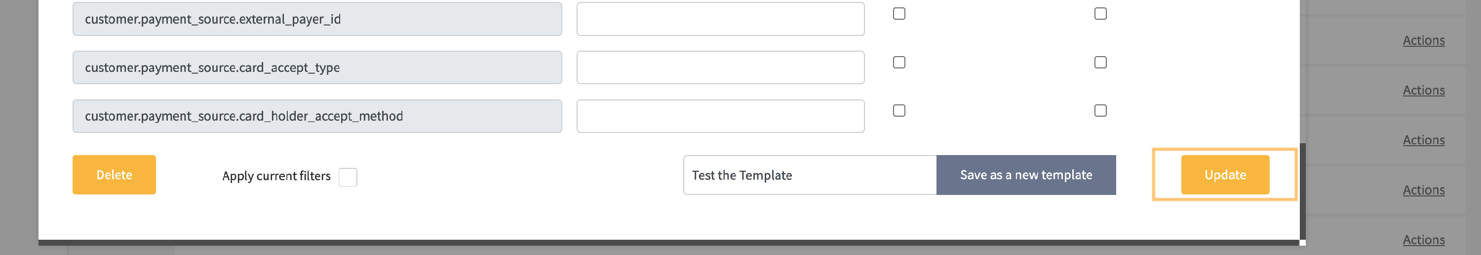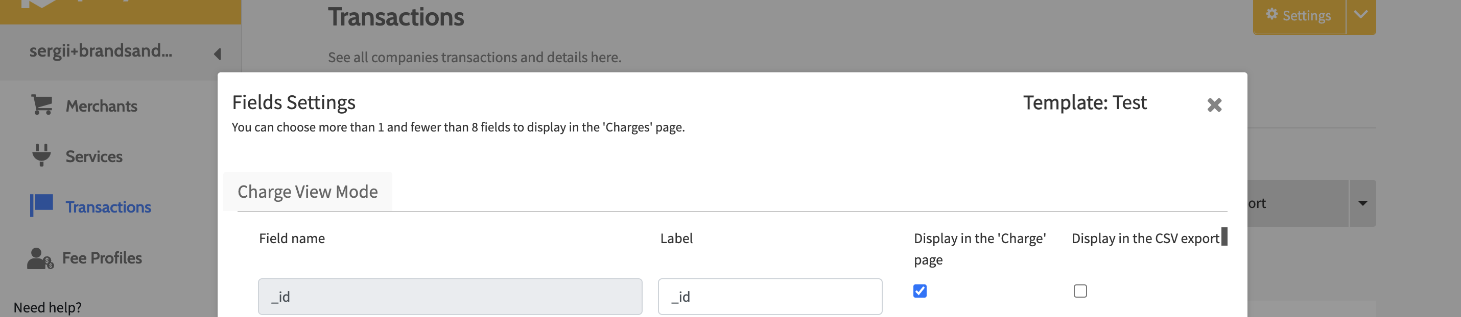 - Select the Fields by checking the Display in the Transactions page or Display in the CSV export. It’s optional to change Label names.