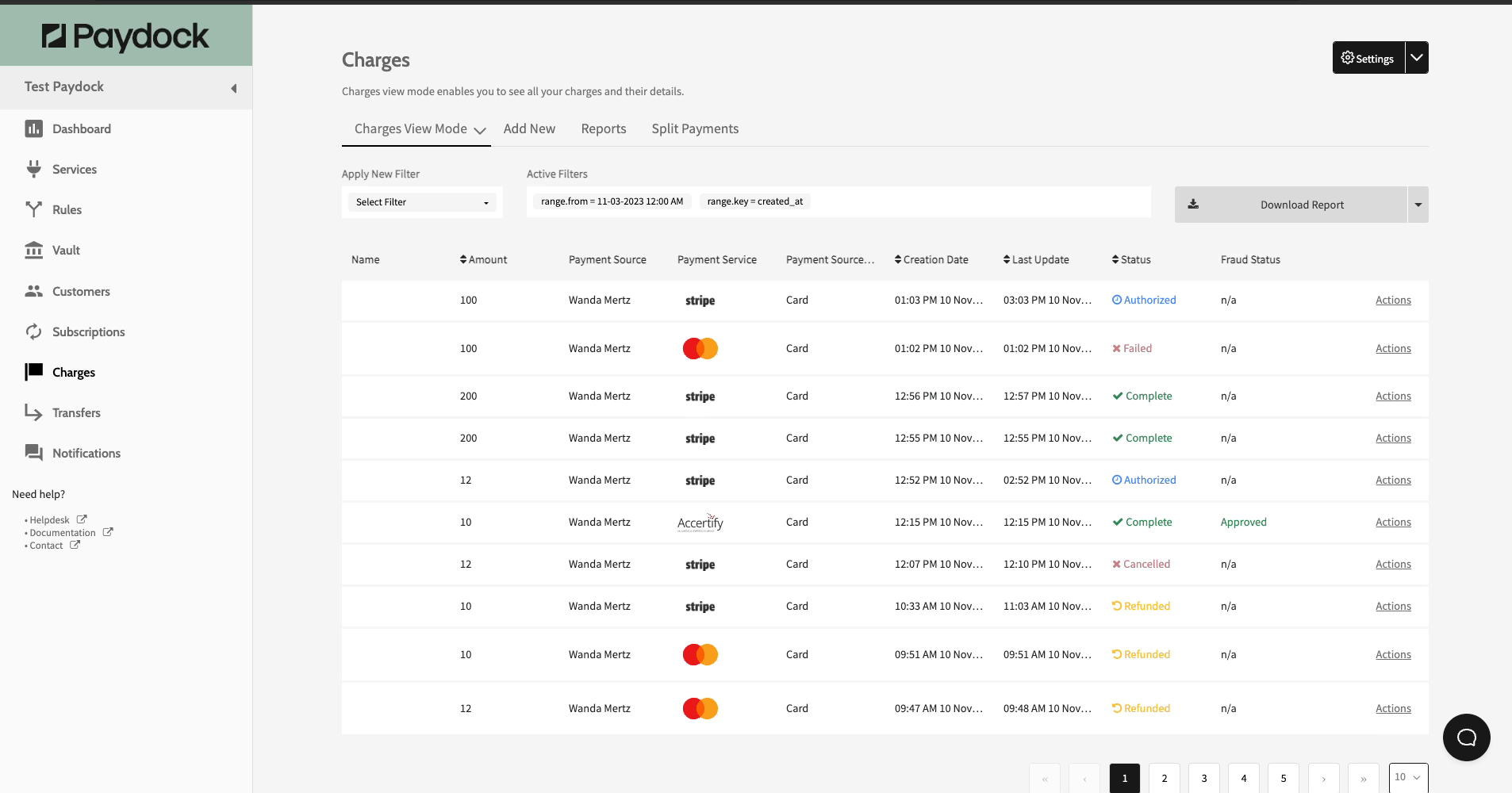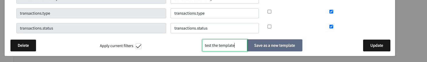 The options for viewing charges and transactions in the dashboard or CSV files are default charge, default txns (=Transactions), or custom templates. A custom template allows the integration of selected pre-defined fields and filters on the charges/transactions page.