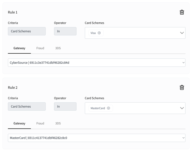 - Another rule could be: If the card scheme is Visa, use the Cybersource gateway and enable the fraud service.