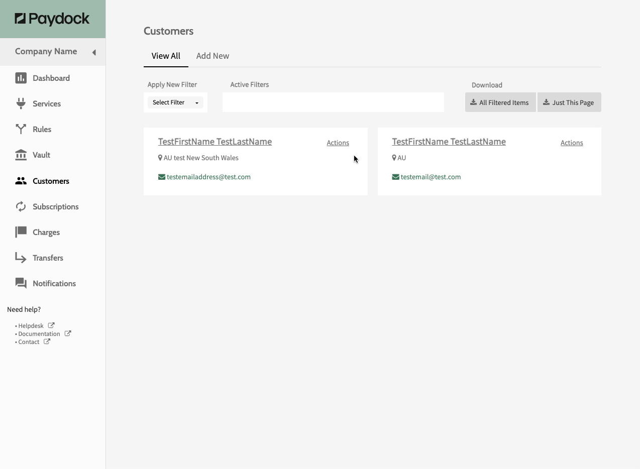 1. Go to Customers > View All > Actions > Add Charge for the specified Customer. You can use the filter option or browse the list.