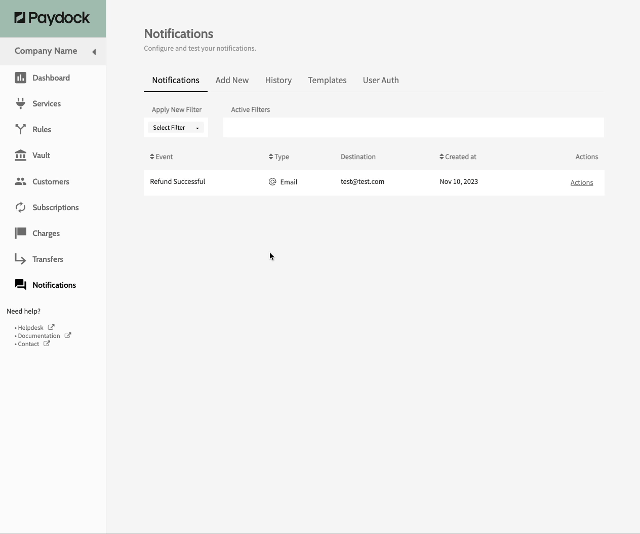 - Go to Notifications > History > Resend for the specified Notification. You can use the filter option or browse the list.