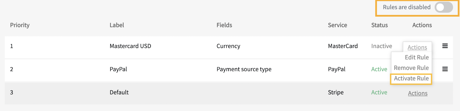 (for Routing) The first created Rule defines the final Gateway and payment flow. Its default status is Active, but subsequent Routing Rules should be activated manually.