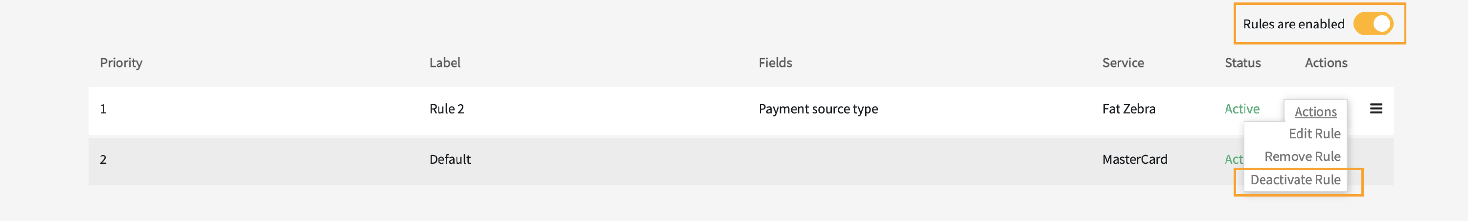 - Click on the Actions > Deactivate Rule for the specified Rule.