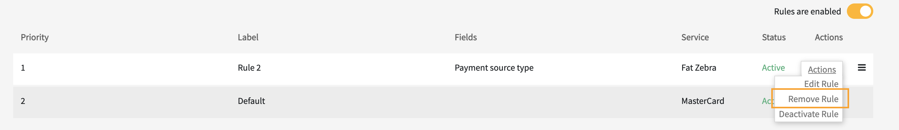 (for both) Before setting up a new Rule, please ensure that the Payment Service you select supports the currency, payment source type, or card scheme.