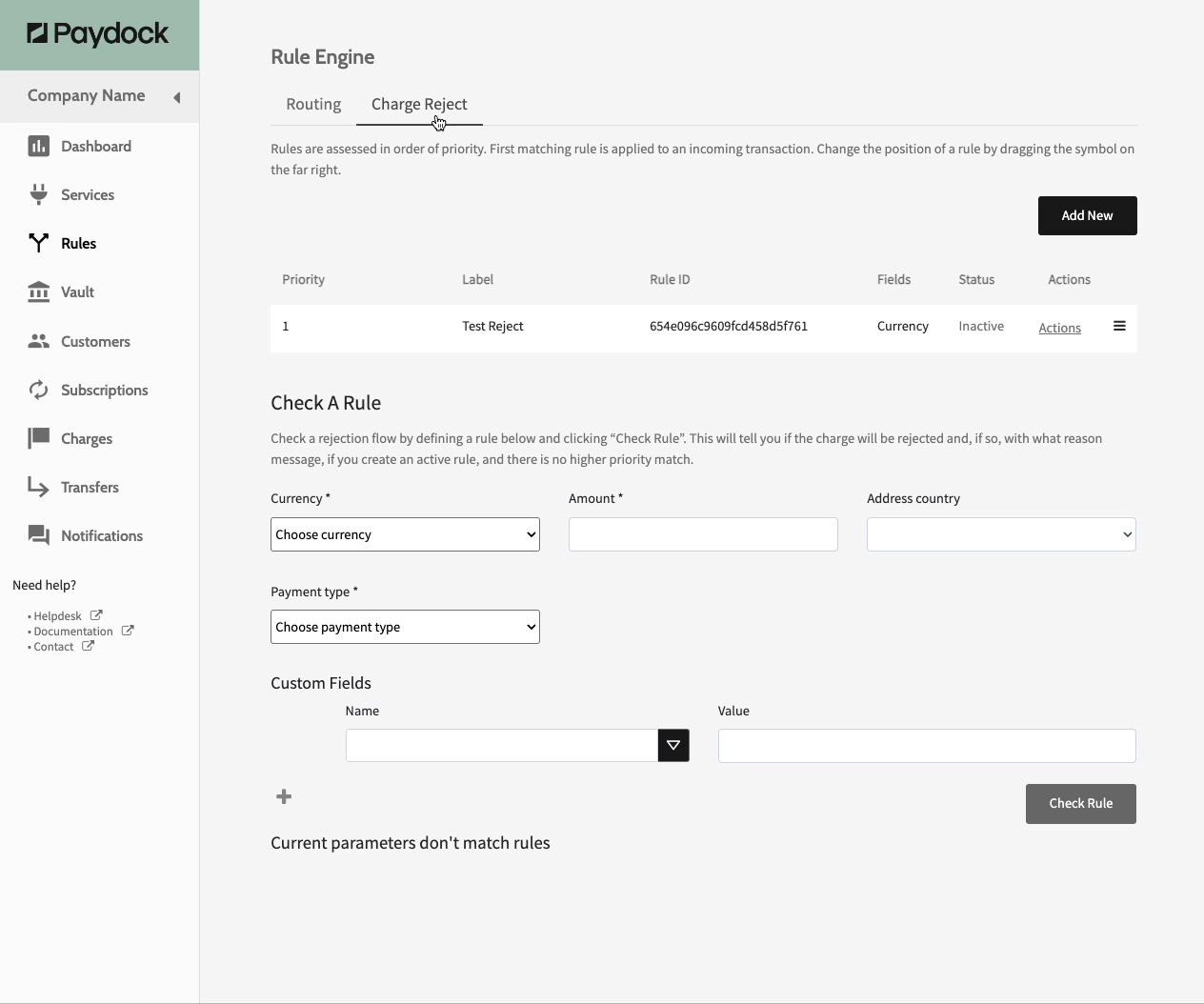 (for Reject) Before sending a request to the Gateway, the Charge is rejected. The default status of any created Reject Rules is Inactive. Therefore, manual activation is required.