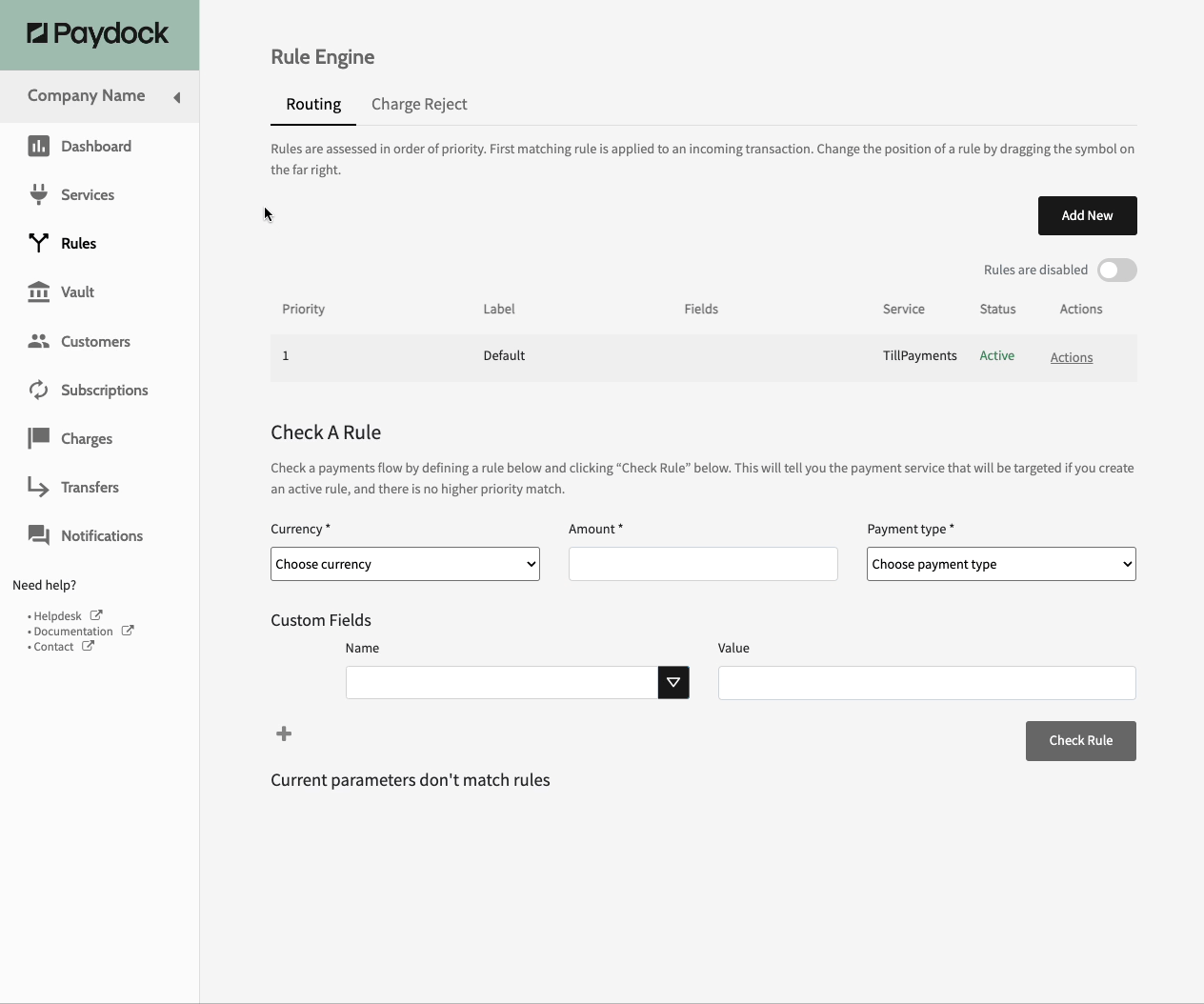 Note: The default Payment Gateway for the entire account under Services overrides the Rules part of the account. Paydock will channel all Charges to the default Gateway unless there is an issue with that Service.