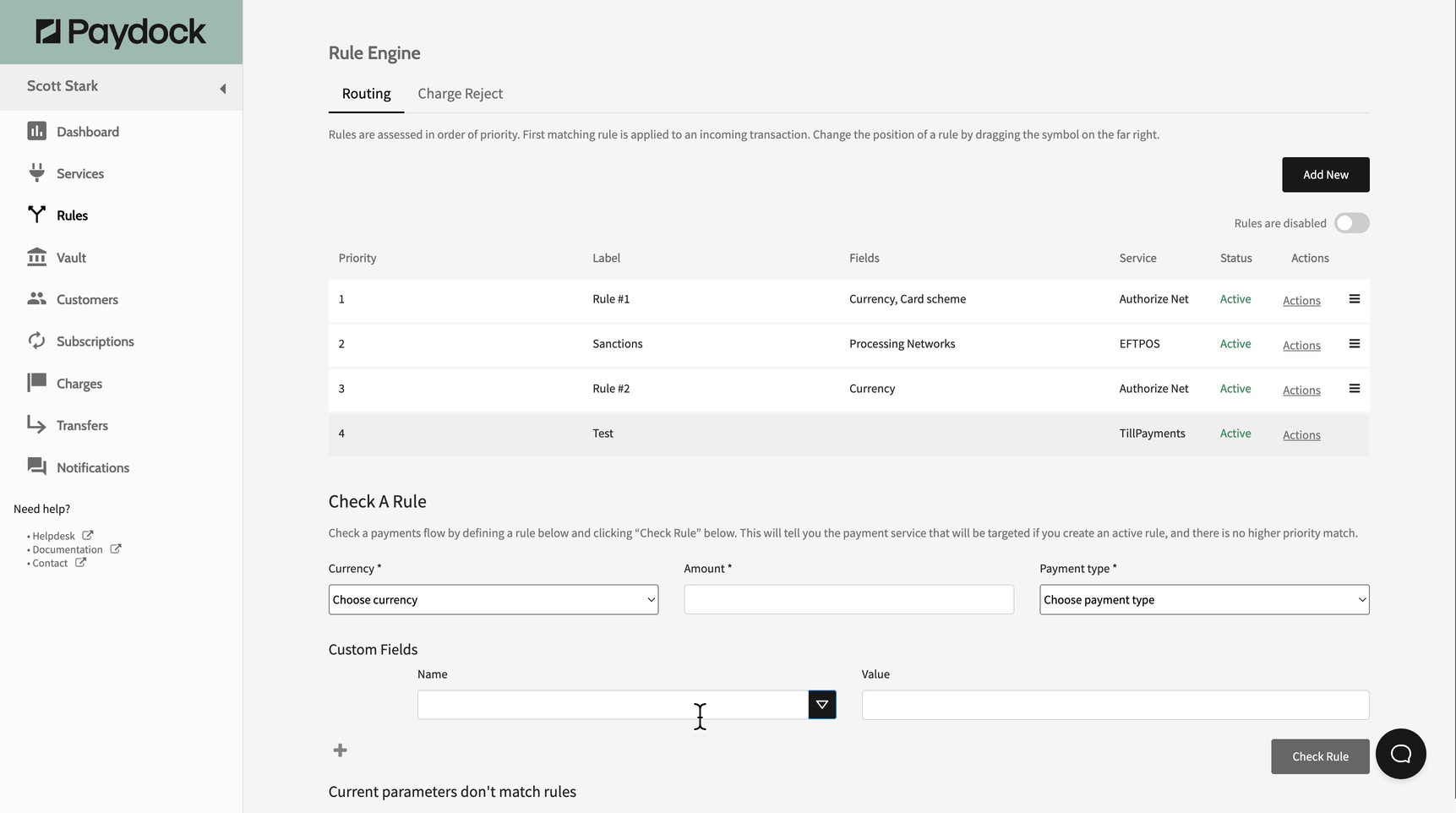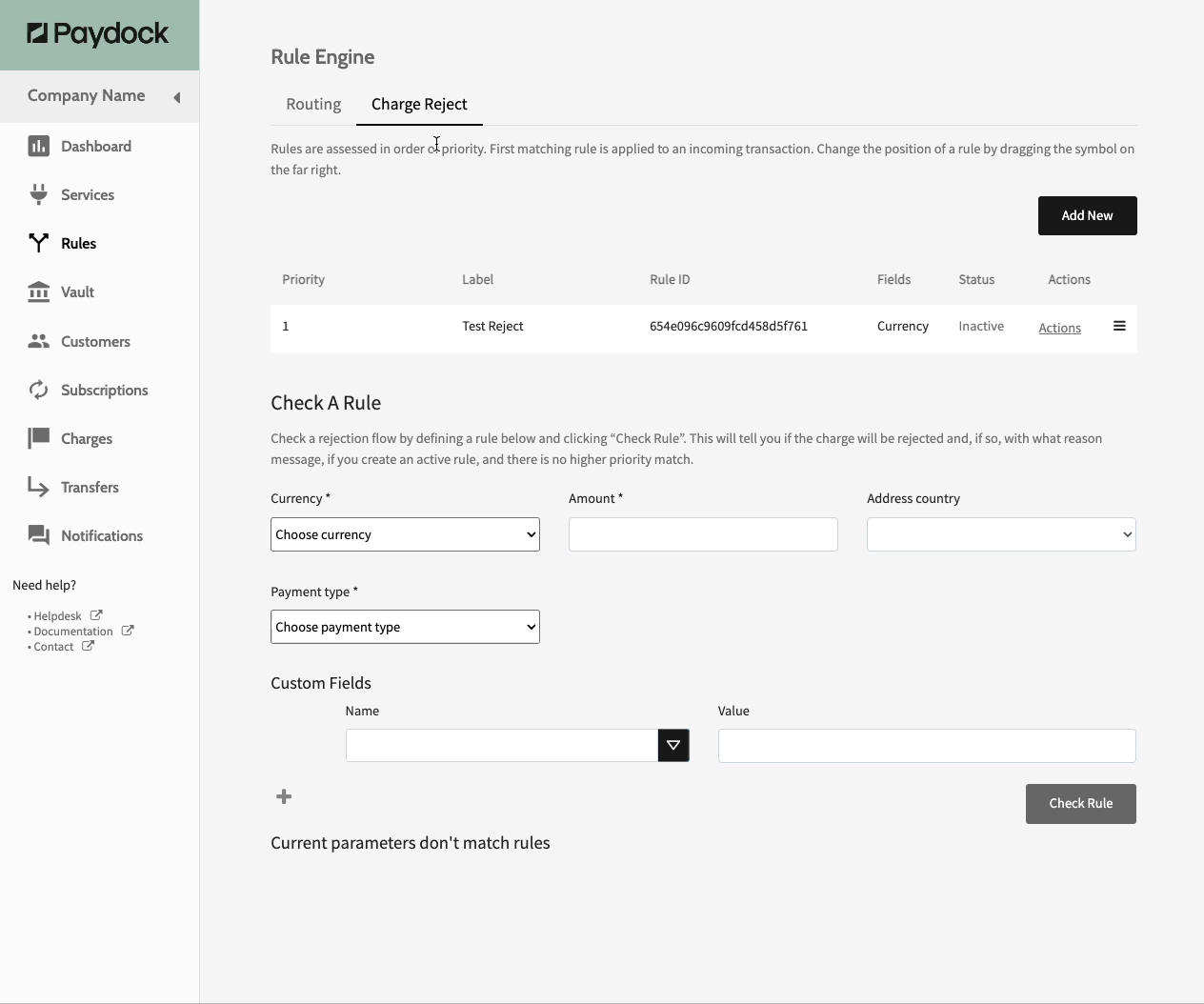 - Go to Rules > Routing or Charge Reject > Check A Rule section.
